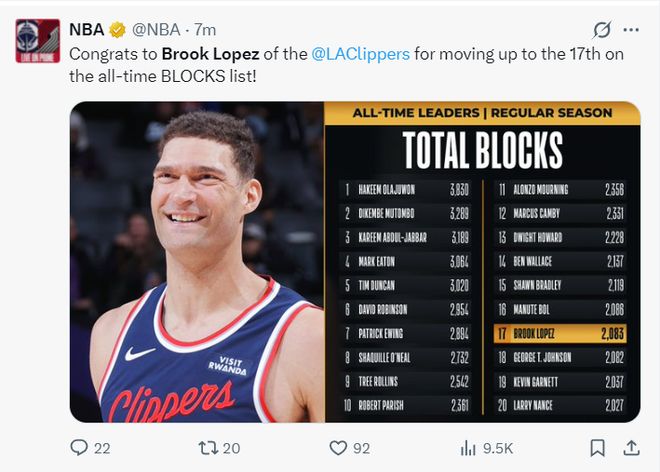 北京时间12月27日,NBA常规赛中,快船队以119-103爆冷开拓者队,取得三连胜。这是属于洛杉矶的夜晚。他的盖帽数升至历史第17位。他单场命中9个三分球,创18年来新高。他的31分创造了快船队的职业生涯新高。他上一次在常规赛比赛中拿下30分是在2023年11月25日,也就是说,他时隔733天拿下30+得分。本场比赛,37岁的老将大罗成为美国热搜第一。这是他的职业生涯之夜,也是大罗在快船队的职业生涯之夜。他在一场比赛中命中了职业生涯最高的9个三分球。本场比赛,泰伦卢更换了阵容。他让37岁的老将中锋罗首发。这是罗本赛季首次首发出场。首节,罗三分线外5投2中,得到8分1助攻0篮板。在第二个 q本场比赛,快船队一度将12分的差距缩小到2分。洛杉矶功劳最大。单节三分3中3+罚球2中2拿下11分。半场洛杉矶拿下19分1助攻0篮板,三分球9中5+三分球8中5+罚球4中4。 19分创下了快船队职业生涯单场得分新高。此前,他场均只有6分,单场最高得分也只有12分。第三节,大罗继续三分命中。他单节三分球5投4中,得到12分3篮板2盖帽。大罗的三分球帮助快船一度领先8分,快船替补席沸腾了。第三节28分钟,洛杉矶三分球13投9中,拿下31分。洛杉矶队单场9个三分球是职业生涯新高。这个纪录在他职业生涯第18年才被打破,而且被打破了首场就被快船队淘汰!罗在最后一节还剩7分钟左右被换下。此时,快船队领先11分。大罗上场时,只投进一记三分,不中,但保护了两个篮板。哈登+科怀联手锁定胜局。最后一节大罗又打了6分钟。全场33分钟,洛杉矶三分球14投9中,拿下31分5篮板1助攻2盖帽,三分命中率高达64.2%。就连快船官方今晚也发文称,洛杉矶直接成为美国热搜第一。 37岁的球员中,单场命中三分球超过9个的只有詹姆斯、库里和洛杉矶。今年夏天,快船队以两年1800万的价格签下了大罗。本赛季的合同只有875万。这游戏值回票价了大罗的外在能力确实很强。